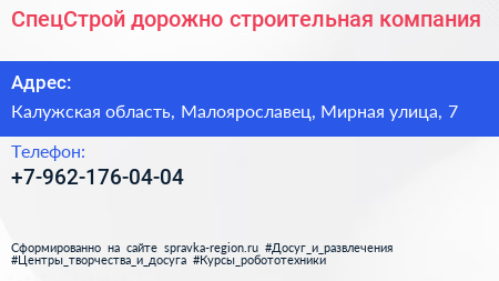 СпецСтрой, дорожно-строительная компания по адресу Калужская область, Малоярославец, Мирная улица, 7 в дальнейшем Организация, размещена в следующих категориях:
