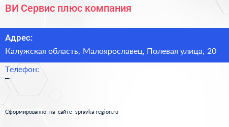 ВИ-Сервис плюс, компания по адресу Калужская область, Малоярославец, Полевая улица, 20 в дальнейшем Организация, размещена в следующих категориях: