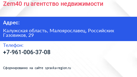 Zem40.ru, агентство недвижимости по адресу Калужская область, Малоярославец, Российских Газовиков, 29 в дальнейшем Организация, размещена в следующих категориях: