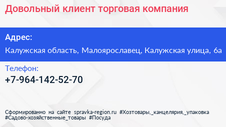 Довольный клиент, торговая компания по адресу Калужская область, Малоярославец, Калужская улица, 6а в дальнейшем Организация, размещена в следующих категориях: