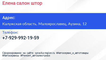 Елена, салон штор по адресу Калужская область, Малоярославец, Аузина, 12 в дальнейшем Организация, размещена в следующих категориях:
