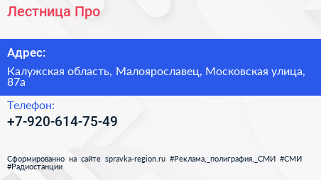 Лестница Про по адресу Калужская область, Малоярославец, Московская улица, 87а в дальнейшем Организация, размещена в следующих категориях: