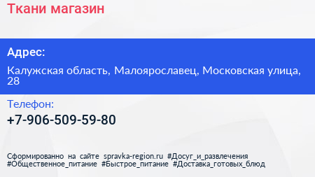 Ткани, магазин по адресу Калужская область, Малоярославец, Московская улица, 28 в дальнейшем Организация, размещена в следующих категориях: