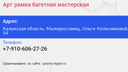 Арт рамка, багетная мастерская по адресу Калужская область, Малоярославец, Ольги Колесниковой, 14 в дальнейшем Организация, размещена в следующих категориях: