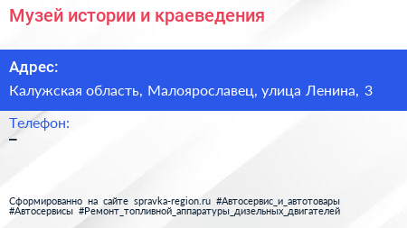Музей истории и краеведения по адресу Калужская область, Малоярославец, улица Ленина, 3 в дальнейшем Организация, размещена в следующих категориях: