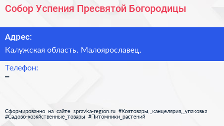 Собор Успения Пресвятой Богородицы по адресу Калужская область, Малоярославец, в дальнейшем Организация, размещена в следующих категориях: