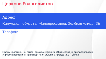 Церковь Евангелистов по адресу Калужская область, Малоярославец, Зелёная улица, 3Б в дальнейшем Организация, размещена в следующих категориях: