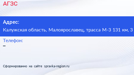 АГЗС по адресу Калужская область, Малоярославец, трасса М-3 131 км, 3 в дальнейшем Организация, размещена в следующих категориях: