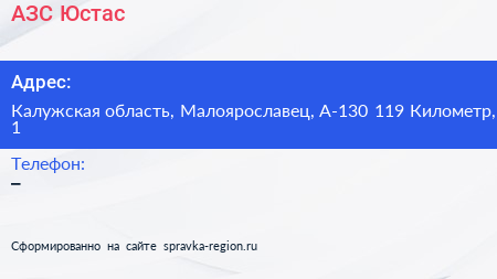 АЗС, Юстас по адресу Калужская область, Малоярославец, А-130 119 Километр, 1 в дальнейшем Организация, размещена в следующих категориях: