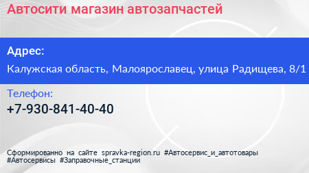 Автосити, магазин автозапчастей по адресу Калужская область, Малоярославец, улица Радищева, 8/1 в дальнейшем Организация, размещена в следующих категориях: