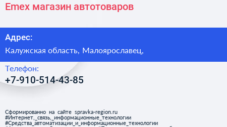 Emex, магазин автотоваров по адресу Калужская область, Малоярославец, в дальнейшем Организация, размещена в следующих категориях: