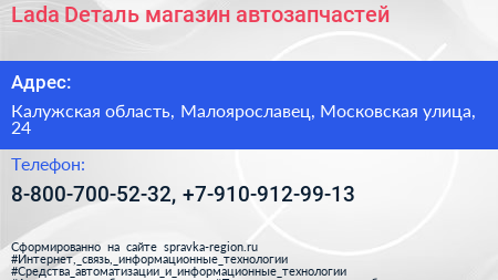 Lada Dеталь, магазин автозапчастей по адресу Калужская область, Малоярославец, Московская улица, 24 в дальнейшем Организация, размещена в следующих категориях: