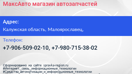 МаксАвто, магазин автозапчастей по адресу Калужская область, Малоярославец, в дальнейшем Организация, размещена в следующих категориях: