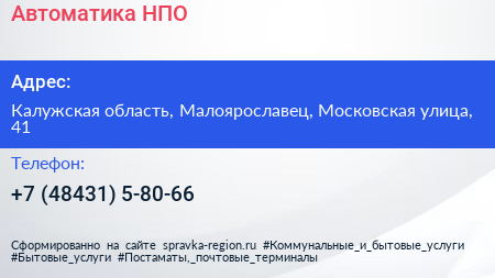 Автоматика, НПО по адресу Калужская область, Малоярославец, Московская улица, 41 в дальнейшем Организация, размещена в следующих категориях: