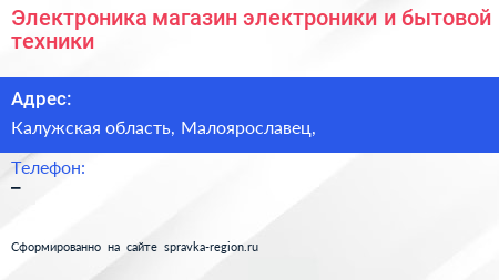 Электроника, магазин электроники и бытовой техники по адресу Калужская область, Малоярославец, в дальнейшем Организация, размещена в следующих категориях: