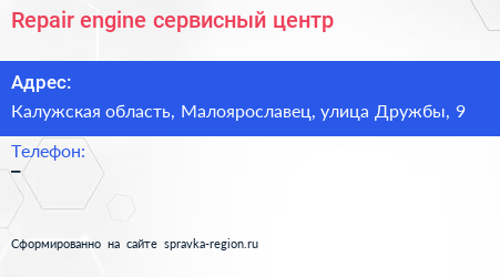 Repair-engine, сервисный центр по адресу Калужская область, Малоярославец, улица Дружбы, 9 в дальнейшем Организация, размещена в следующих категориях: