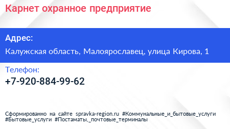 Карнет, охранное предприятие по адресу Калужская область, Малоярославец, улица Кирова, 1 в дальнейшем Организация, размещена в следующих категориях: