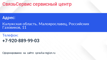СвязьСервис, сервисный центр по адресу Калужская область, Малоярославец, Российских Газовиков, 11 в дальнейшем Организация, размещена в следующих категориях: