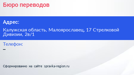 Бюро переводов по адресу Калужская область, Малоярославец, 17 Стрелковой Дивизии, 2в/1 в дальнейшем Организация, размещена в следующих категориях: