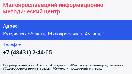 Малоярославецкий информационно-методический центр по адресу Калужская область, Малоярославец, Аузина, 1 в дальнейшем Организация, размещена в следующих категориях: