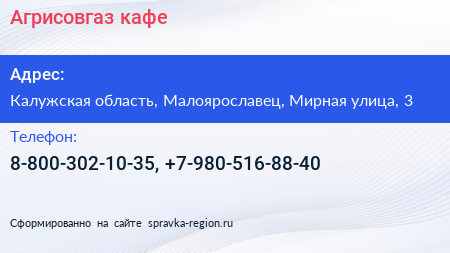 Агрисовгаз, кафе по адресу Калужская область, Малоярославец, Мирная улица, 3 в дальнейшем Организация, размещена в следующих категориях: