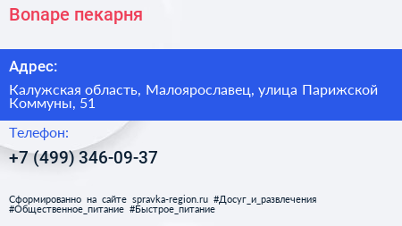 Bonape, пекарня по адресу Калужская область, Малоярославец, улица Парижской Коммуны, 51 в дальнейшем Организация, размещена в следующих категориях: