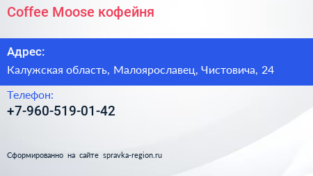 Coffee Moose, кофейня по адресу Калужская область, Малоярославец, Чистовича, 24 в дальнейшем Организация, размещена в следующих категориях: