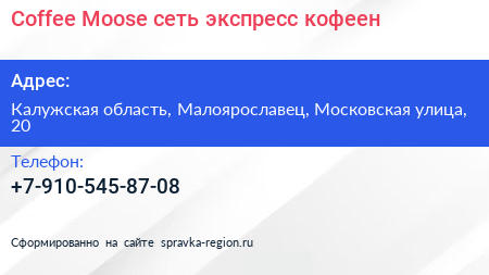 Coffee Moose, сеть экспресс-кофеен по адресу Калужская область, Малоярославец, Московская улица, 20 в дальнейшем Организация, размещена в следующих категориях: