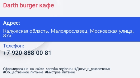Darth burger, кафе по адресу Калужская область, Малоярославец, Московская улица, 87а в дальнейшем Организация, размещена в следующих категориях: