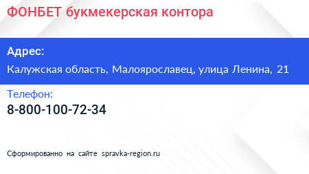 ФОНБЕТ, букмекерская контора по адресу Калужская область, Малоярославец, улица Ленина, 21 в дальнейшем Организация, размещена в следующих категориях: