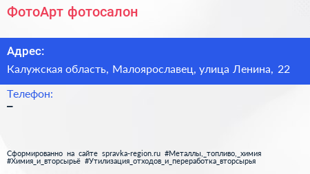 ФотоАрт, фотосалон по адресу Калужская область, Малоярославец, улица Ленина, 22 в дальнейшем Организация, размещена в следующих категориях: