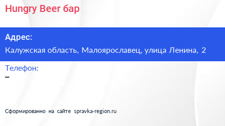 Hungry Beer, бар по адресу Калужская область, Малоярославец, улица Ленина, 2 в дальнейшем Организация, размещена в следующих категориях: