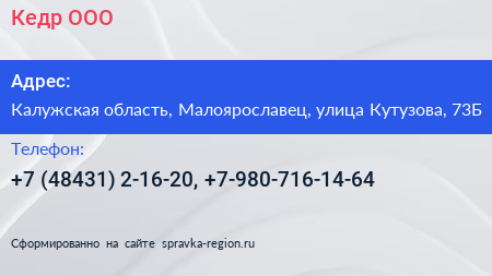 Кедр, ООО по адресу Калужская область, Малоярославец, улица Кутузова, 73Б в дальнейшем Организация, размещена в следующих категориях: