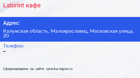 Labirint, кафе по адресу Калужская область, Малоярославец, Московская улица, 20 в дальнейшем Организация, размещена в следующих категориях: