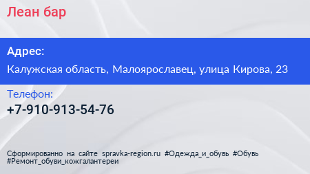 Леан, бар по адресу Калужская область, Малоярославец, улица Кирова, 23 в дальнейшем Организация, размещена в следующих категориях: