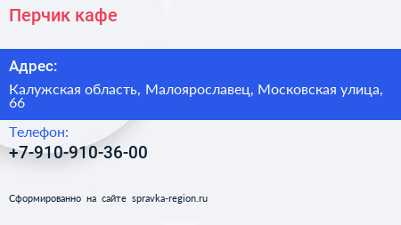 Перчик, кафе по адресу Калужская область, Малоярославец, Московская улица, 66 в дальнейшем Организация, размещена в следующих категориях: