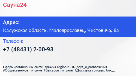 Сауна24 по адресу Калужская область, Малоярославец, Чистовича, 8а в дальнейшем Организация, размещена в следующих категориях: