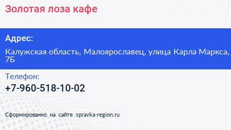 Золотая лоза, кафе по адресу Калужская область, Малоярославец, улица Карла Маркса, 7Б в дальнейшем Организация, размещена в следующих категориях: