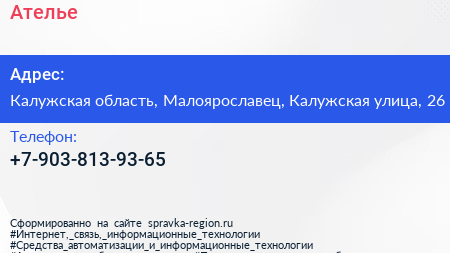 Ателье по адресу Калужская область, Малоярославец, Калужская улица, 26 в дальнейшем Организация, размещена в следующих категориях: