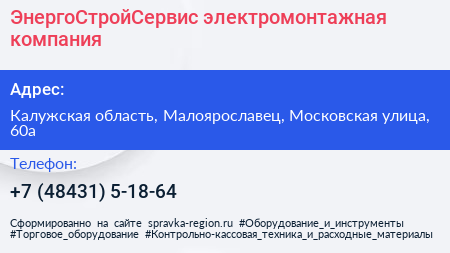 ЭнергоСтройСервис, электромонтажная компания по адресу Калужская область, Малоярославец, Московская улица, 60а в дальнейшем Организация, размещена в следующих категориях: