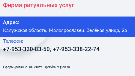 Фирма ритуальных услуг по адресу Калужская область, Малоярославец, Зелёная улица, 2а в дальнейшем Организация, размещена в следующих категориях:
