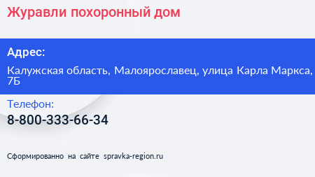 Журавли, похоронный дом по адресу Калужская область, Малоярославец, улица Карла Маркса, 7Б в дальнейшем Организация, размещена в следующих категориях: