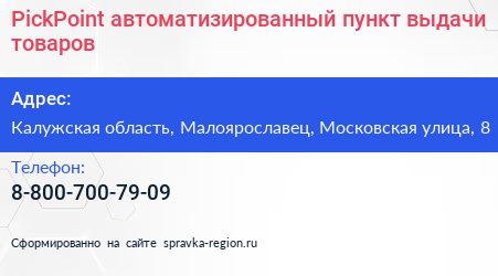 PickPoint, автоматизированный пункт выдачи товаров по адресу Калужская область, Малоярославец, Московская улица, 8 в дальнейшем Организация, размещена в следующих категориях: