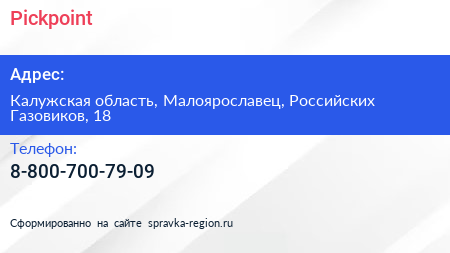Pickpoint по адресу Калужская область, Малоярославец, Российских Газовиков, 18 в дальнейшем Организация, размещена в следующих категориях: