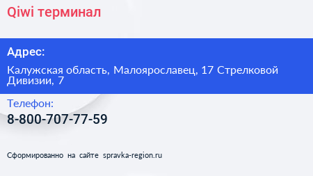 Qiwi, терминал по адресу Калужская область, Малоярославец, 17 Стрелковой Дивизии, 7 в дальнейшем Организация, размещена в следующих категориях: