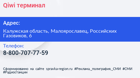 Qiwi, терминал по адресу Калужская область, Малоярославец, Российских Газовиков, 6 в дальнейшем Организация, размещена в следующих категориях: