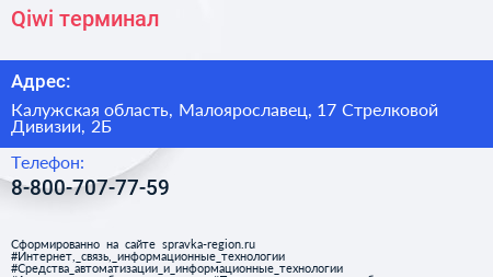 Qiwi, терминал по адресу Калужская область, Малоярославец, 17 Стрелковой Дивизии, 2Б в дальнейшем Организация, размещена в следующих категориях: