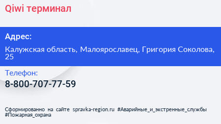 Qiwi, терминал по адресу Калужская область, Малоярославец, Григория Соколова, 25 в дальнейшем Организация, размещена в следующих категориях: