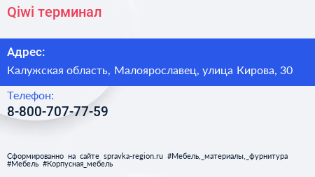 Qiwi, терминал по адресу Калужская область, Малоярославец, улица Кирова, 30 в дальнейшем Организация, размещена в следующих категориях: