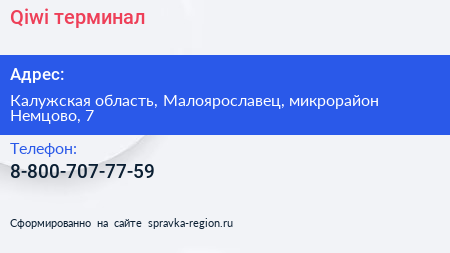 Qiwi, терминал по адресу Калужская область, Малоярославец, микрорайон Немцово, 7 в дальнейшем Организация, размещена в следующих категориях: